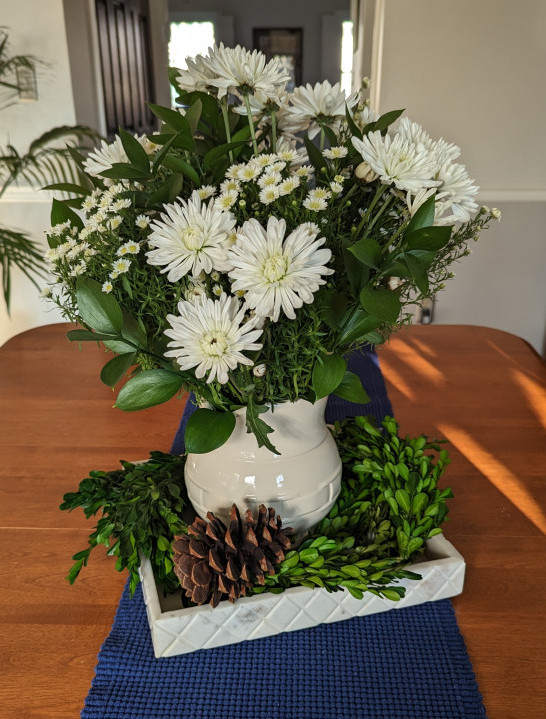Brighten up your kitchen or dining room table with a homemade centerpiece. You’ll need groupings of cut stems, hand clippers, wet floral foam, and a container in which to put the pieces. The video below explains how to arrange the boughs. Instead of adding candles, you can go to your local grocery store and buy fresh cut flowers that have more woody stems. The wood stems are easier to stick into the floral foam. Here is a video that teaches how to easily create a simple centerpiece.