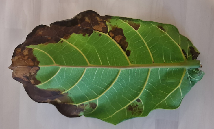 3. Underwatering is also a big killer of Fiddle Leaf Figs. The rim of the leaves will begin to curl in and turn brown. Eventually this condition will extend throughout the entire leaf and it will fall off. Be sure to use one of the methods above to determine whether your plant needs to be watered.