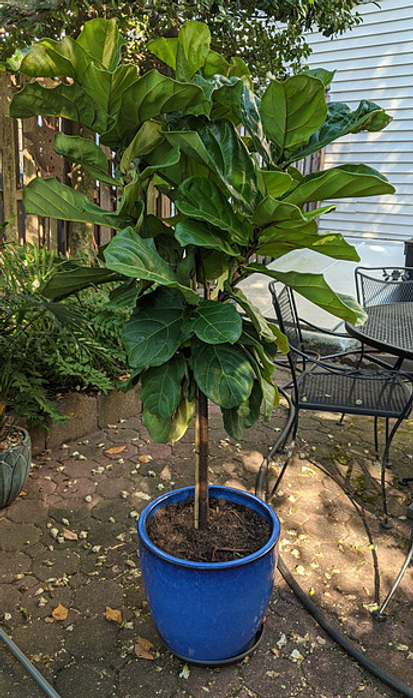 Fiddle Leaf Fig plants like to be kept consistently, evenly moist with a brief drying out period between waterings. I have an inexpensive moisture meter that quickly tells me whether or not my plants need watering. Just stick the probe into the soil at least 4 inches deep and half way between the trunk of the plant and the edge of the pot and read the meter. If your plant is dry, give it a good, slow, thorough watering until the water seeps from the drainage hole. Use the probe on the meter to break up any hardened soil on top to encourage better drainage throughout the soil.